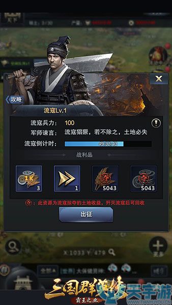 那么战鼓怎么获得呢?首先就是击杀流寇,击杀流寇有几率获得战鼓。流寇就是你城外的土地上的毛贼,占领土地后,流寇就会来你的土地上捣乱,流寇刷新有规则,每天9点、13点、17点会刷新,但是你不打掉上一波的流寇,那么流寇就不会刷新,流寇是刷战鼓最主要的途径。所以城主们在看见主城周围的流寇时一定不能轻易放过。