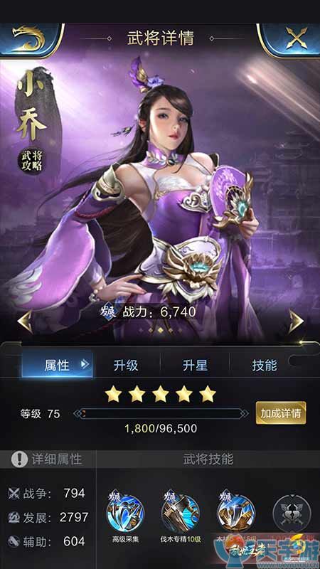 小乔是新手阶段玩家就可以获得,并提升到5星的发展类武将,她拥有高级采集技能,一般会被玩家派遣到联盟资源场去采集。前期玩家花费最大的就是木材,主城升级、城墙升级同时需要消耗大量木材,所以非常木材非常关键,所以这里小乔学习的技能为木材采集。