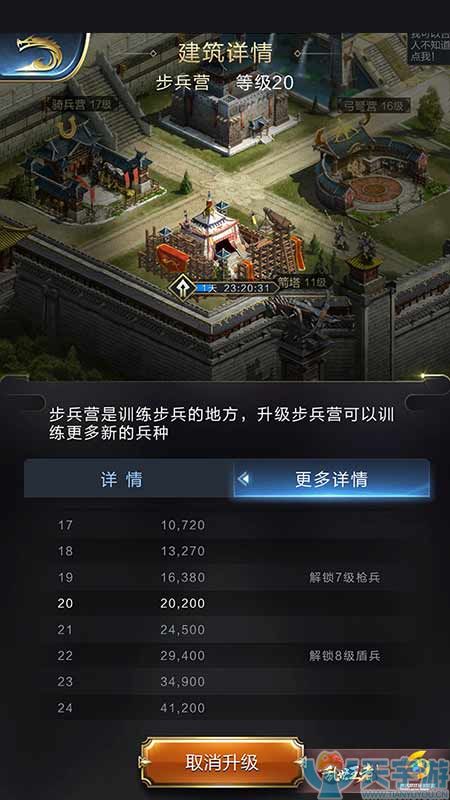 首先我们都知道等级高的兵种即便兵少,战斗力与发挥也更高。这里举例,当我们主城22级升23级的时候,升级主城就需要解锁22的兵营,22级的兵营刚好可以解锁的是兵种搭配是7枪+8盾,而枪兵的攻击力更高,所以推荐使用枪兵,而战争类武将枪兵加成最高的是张飞,所以这里驻防最好的武将推荐就是张飞。