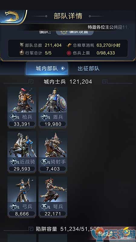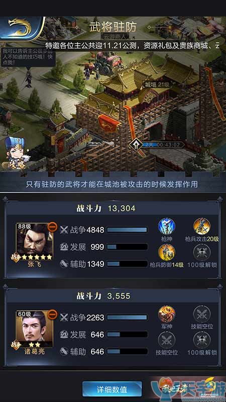 驻防兵种:驻防选择张飞后,城内部队尽量要以枪兵为主,前期主要以7级枪兵为主,随着主城升级可以晋升为9级枪兵。