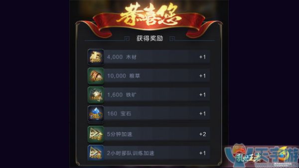 战利品:木4000、粮1w、铁1600、宝石160、5分钟加速2、2小时训练加速1