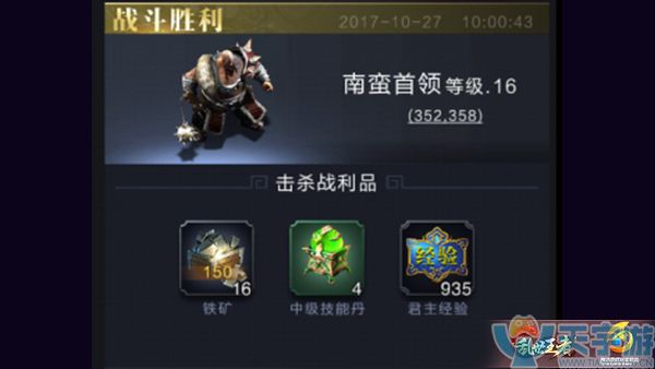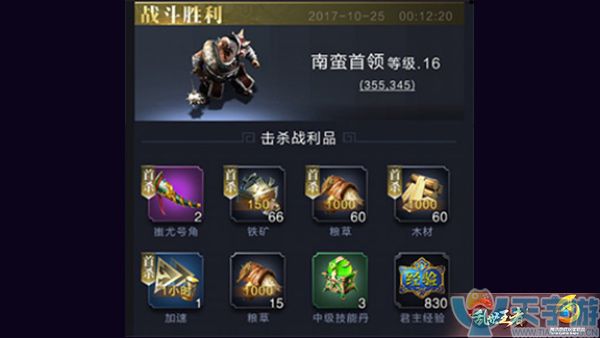 野怪(首杀):粮7.5w、木6w、铁9千、中级技能丹3、一小时加速1、君主经验830、蚩尤号角2