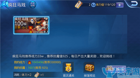 天天炫斗疯狂马戏副本的准入战力和准入抗魔值分别为20w和875。当然了玩家的战力和抗魔值越高对于副本的通关就越有利。玩家成功通关之后会获得马戏勋章,该勋章可以用来兑换称号、怪物和坐骑。