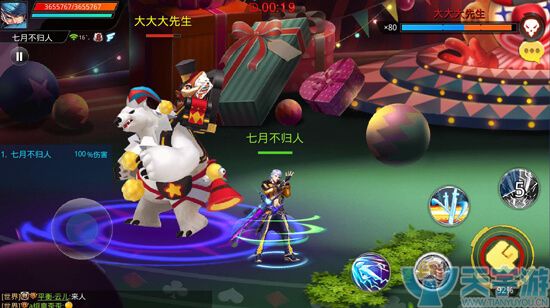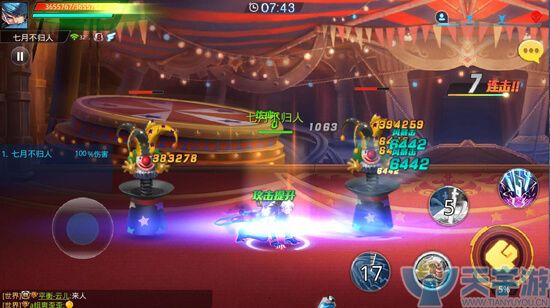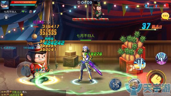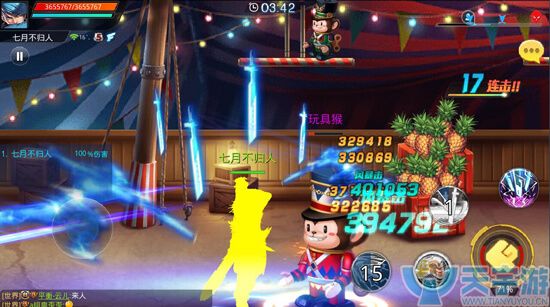 第一阶段玩家会遇到三波小丑,小丑只有一种攻击方式,那就是发射彩球。因为小丑的数量过多,小丑刚刚出现的时候,玩家应该采取退让措施!先主动往空旷的地方移动。当彩球全部被吸引之后,在利用位移技能瞬间移动到小丑所在地,然后利用群攻技能消灭小丑即可。