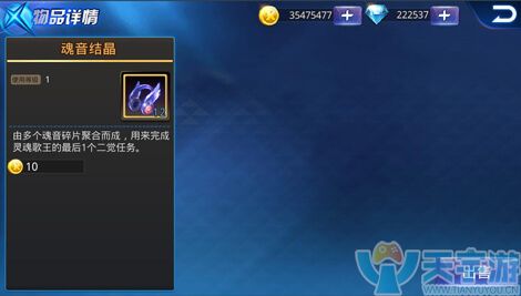 卢卡斯通关灵魂歌王二觉副本就可以获取魂音碎片道具,该道具可以用来完成灵魂歌王的前五个觉醒任务。至于最后一个觉醒任务,则需要玩家通过魂音碎片来兑换魂音结晶来完成。目前10个魂音碎片可兑换一个魂音碎片结晶。当兑换完成之后,魂音结晶是无法再次兑换成魂音碎片的。