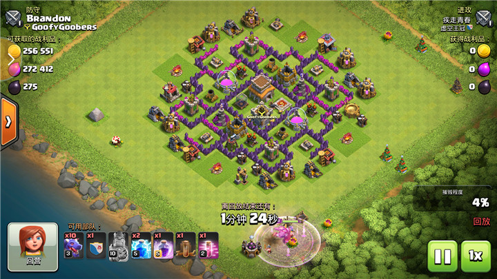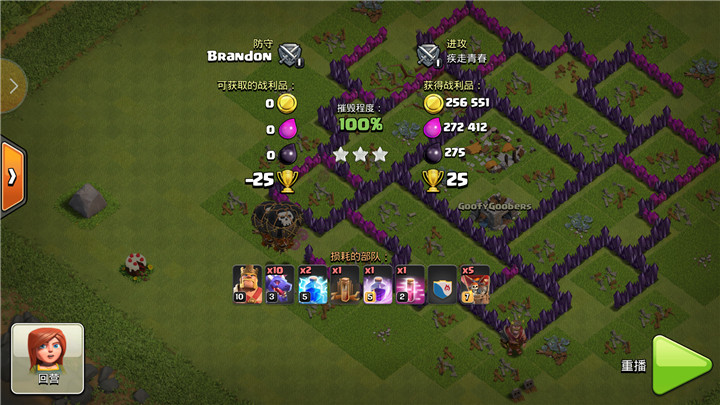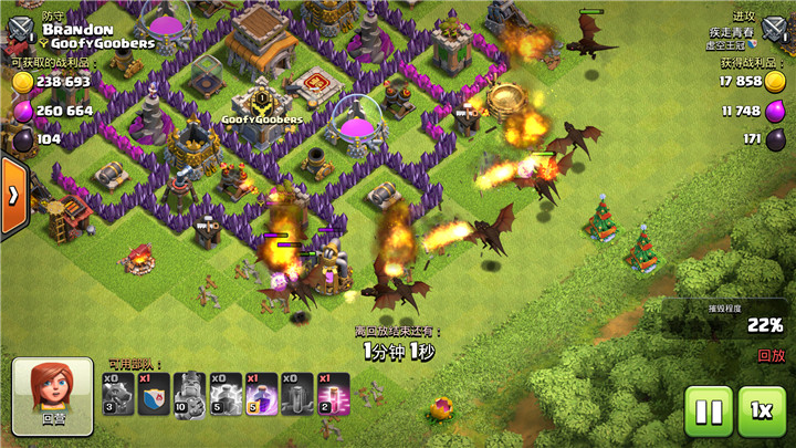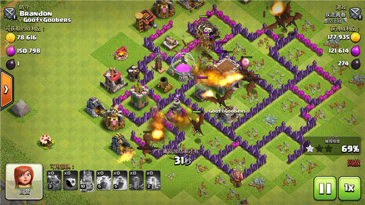 这个时候大局已定了,黑球不但可以炸掉防空,还可以顺带将剩下的箭塔和电塔全部打掉,只需要等着龙将所有的建筑拆完就好了。