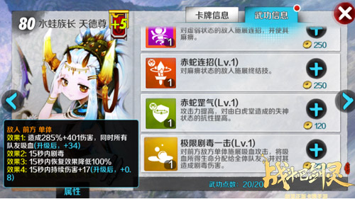 德天尊是战斗吧剑灵赤蛇堂里较为出色的一个刺客,推荐赤蛇堂的玩家培养,德天尊的内力需求较少(30点),武功可以在攻击敌人的同时吸血恢复生命并且让目标陷入中毒状态。可以作为麻痹状态的发动机,在敌人虚弱的时候可以对其施展连招并使其陷入麻痹状态,升至8星后还可以将吸血所获得的生命值分配给全体队友。
