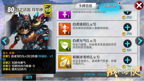 月华神的和新技能,在高等级战斗中拥有一张可以减少敌人内力的卡牌将直接影响战斗胜利的最终结果,月华神的武功可以降低敌人的内力延缓其武功的释放,而且月华神拥有这极强的气功群体输出能力。