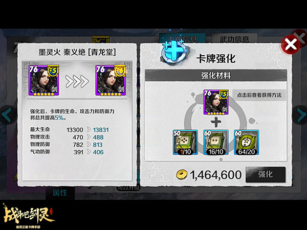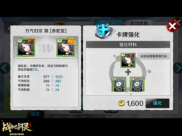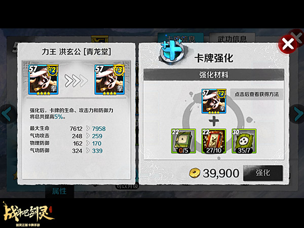 强化后,卡牌的生命、攻击力和防御力将总共提高5%。强化到了后期,所带来的总属性加成还是非常多的。所以主力阵容的强化是提升战力的一个重要途径。