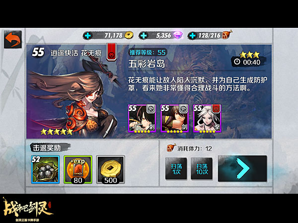 这一关的系统推荐阵容是前排力士金刚罗汉、刺客子俊、剑士水夜叉,后排是召唤师坎和拳师金燕。金刚罗汉的护罩可以保证自己的生存能力,一旦被沉默后,只要有护罩就可以残血等待坎的救援。刺客子俊可以直接消除花无痕的防护罩。金燕的反伤可以弥补这套阵容的输出不足。
