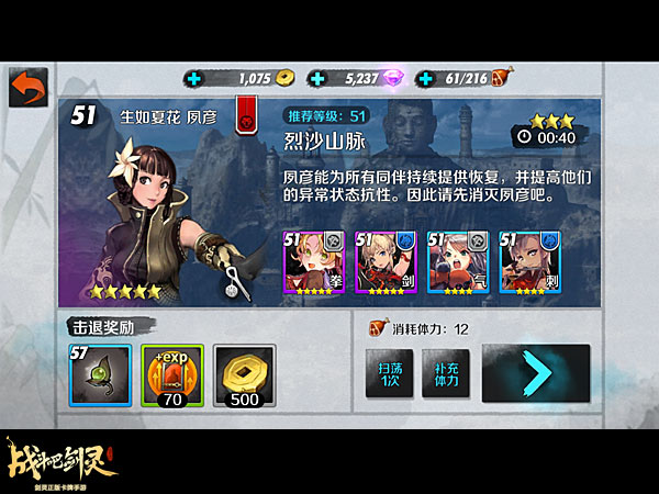 《战斗吧剑灵》烈沙山脉的第九关,又是一个需要战术性卡牌张俊易的特殊关卡。这一关的BOSS夙彦能够持续的为所有同伴恢复,所以如果不能消除这样的强化效果,或者不能先击杀她的话,是很难过关的。