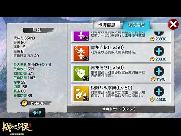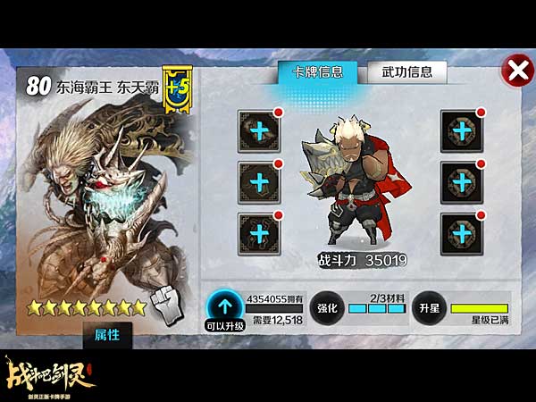 首先看下八星卡牌终极技能的变化。八星的卡牌在对战中,一共下面有红、蓝、黄三个条。红色是血量,蓝色是内力,黄色就是决定着终极技能的释放了。释放的条件是,蓝色的条满一次,黄色的向前一格。黄色的满了之后,蓝色的再满一次,终极技能就释放一次了。以东天霸为例,由于是40内,也就是说,蓝色是4回合满一次,黄色是2格,也就是说8回合黄色满。再等一次蓝色满,就是一共要12回合可以放一次终极技能。