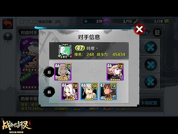 《战斗吧剑灵》天下争霸玩法中,玩家对于阵容的搭配开始走向系统化。针对卡牌的武功特点,搭配出能够打出连招伤害的眩晕流、虚弱流;针对敌方后排弱点搭配出换位流;强势卡牌较多的玩家直接可以搭配出强攻流;而沉默技能较多的玩家还可以搭配出控制流打法。