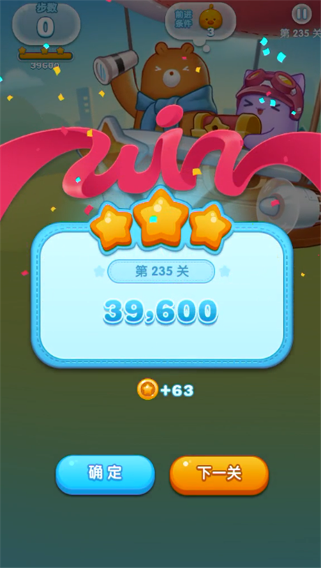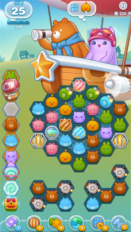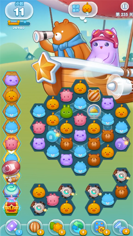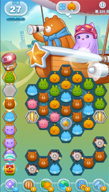 通关条件:每收集3个黄色棋子,飞艇前进1步,飞艇到达宝箱处即可。
