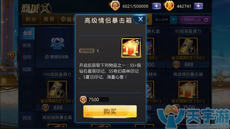 综合以上来看高级情侣暴击箱就是公会玩家的必备之物,而且高级情侣暴击箱的售价并不贵,只需要玩家花费7500的公会贡献就可入手。玩家入手高级情侣暴击箱之后就有一定的几率开到SS+级钻石星辰印记、ss奇幻森林印记、s夏日印记、海量心意。
