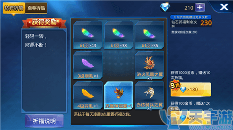 其中凤凰神羽之翼最高可为玩家提供35510点战力,而赤练骑兵之翼大家都很熟悉,是B级翅膀中的极品!至于浴火凤凰之翼,则是A级翅膀中的佼佼者,不管是战力还是技能,都非常强大!有兴趣的小伙伴,抓紧时间进入钻石祈福吧!