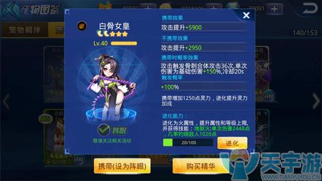宠物点评:白骨女皇这个宠物是属于主动攻击型宠物,在JJC中如果白骨女皇开局就释放技能的话,在整场战斗中白骨女皇大概可以释放四次攻击,白骨女皇在攻击时周围会出现光圈,这个时候处在光圈范围内的敌人都会受到伤害,并且持续几秒中。