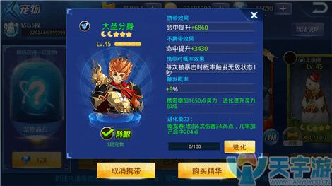宠物点评:物是人非,属性永恒。不管天天炫斗中出现何种宠物,已有宠物的属性都不会发生变化,所以大圣分身依旧还是JJC中的王者,其实大圣分身最大的亮点就是在于无敌效果。自从大圣分身登场之后,几乎高端PVP中都会出现大圣分身风骚的身影。