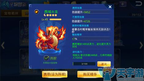 宠物评价:西域火龙作为平民玩家最爱的宠物也不是没有道理的,毕竟像大圣分身这么高端大气上档次的宠物,不是每个人都能获得的。所以西域火龙的作用就凸显了,如果玩家坚持用西域火龙作战的话。那么笔者建议玩家尽量升级西域火龙,因为西域火龙的品质越高,技能触发的概率就越高。