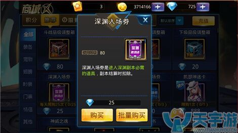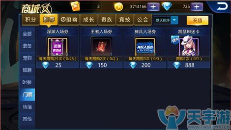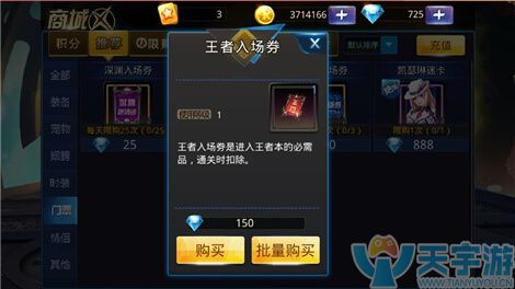 王者峡谷的副本绝对是炫斗中道具出产种类最多的副本了,包括高级宠物,高级称号,高级羽翼等等,进入王者副本需要消耗一张王者入场券,虽然每天系统会更新2张入场券,但是2张是远远赶不上需求的,所以多余的钻石用来购买一些王者入场券还是很不错的。