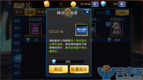 神兵入场券是进入神兵入场券,在目前版本下全新开启的T3风系神兵无疑开启了神兵竞争大潮,收集T3神兵无论在PK中还是副本中都会有压倒性的优势。T3神兵副本每天可以挑战2次,每次消耗3张入场券,虽然系统每天会送三张,但是这只够我们挑战一次T3神兵副本,所以每天花费多余的钻石购买3张神兵入场券还是很有必要的。