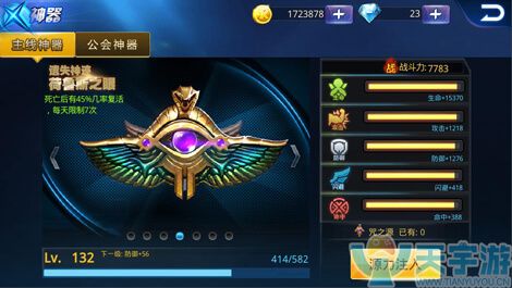 荷鲁斯之眼:荷鲁斯之眼是专门为副本量身打造的神器,玩家在副本中出现死亡时会触发该神器的复活效果。不过这个触发是有概率存在的,神器的等级越高触发的概率就越高。比如说笔者的荷鲁斯之眼等级为132级,它的触发概率就为百分之四十五,每天限制7次,所以说想要提升复活几率,就赶快的去升级该神器吧。