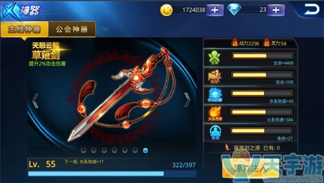 草雉剑:该神器的主要效果就是按照百分比提升玩家的攻击伤害,草雉剑神器的等级越高给玩家带来的加成伤害就越高。这个神器还可以给玩家带来水系防御、火系伤害、免伤等高能效果的加成,所以这个神器对于玩家来说是非常重要。