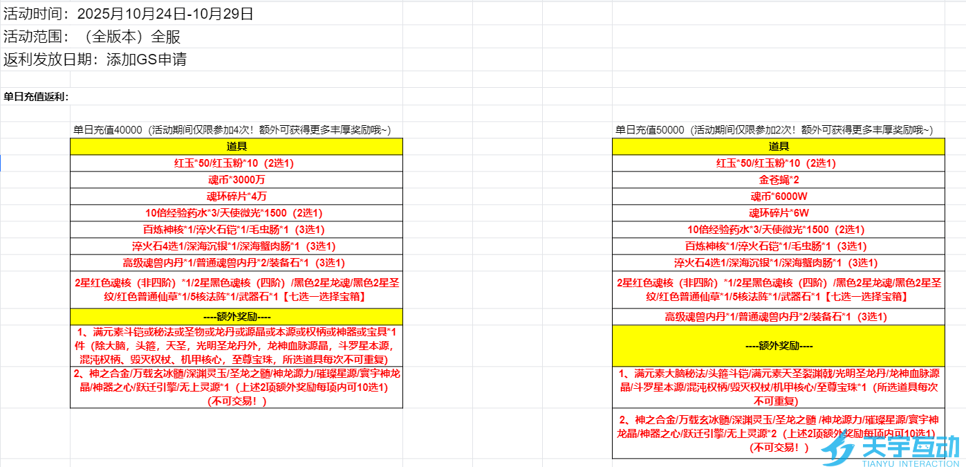 斗罗五一活动返利方案活动时间:2025.5.1-2025.5.7,活动结束后3天内登记完毕,之后提交的申请不再处理单笔活动:活动期间1次 单日活动:每日可领1次(按最高档位申请)限时三元素:不可与日常返利活动叠加,不可与本期其他返利叠加(因返利活动类型较多,若玩家有单日10W或50W的大额充值意向,可争取额外道具)活动时间:2025.5.1-2025.5.7,活动结束后3天内登记完毕,之后提交的申请不再处理活动范围:全区服活动内容:单笔 单日活动形式限定次数备注单笔98活动期间1次活动限制领取1次(单笔方案2选1)申请此方案时,可同时申请符合额度的日常返利方案单笔648单日充值1000每日可领1次按最高档位申请申请此方案时,可同时申请符合额度的日常返利方案例如:充值7500,即可申请此方案的7500档位也可申请日常返利方案的5000档位单日充值3500(7天内限领3次)单日充值7500单日充值15000单日充值35000单日充值85000限时三元素方案每日可参与☆不可与日常返利活动叠加,不可与本期其他返利叠加如果有玩家有大额充值意向可以提前添加GS进行收录,方便沟通返利,更快申请一.单笔返利:(2个单笔充值档位,任选一个参与)单笔充值98单笔充值648道具数量价值道具数量价值单笔充值,金额超过不可以魂骨宝箱198红色魂骨自选宝箱13005倍经验药水120闪耀星辰币2100坐骑精通石36010倍经验药水180钨钢100100深海蟹肉肠1100魂币600000020高阶攻击魂石10100魂环碎片1000020红玉100100魂币1200000040魂环碎片2000040二.单日充值返利:(兼容常驻返利,按最高档位领取,比如:单日充2K,领取日常返利2K档+限时1K档,仅限于限时活动开启期间)单日充值道具数量备注1000闪耀星辰币2香肠自选宝箱1万年兽魂30钨钢30魂币9000003500黑色2星魂核/龙魂/圣纹自选1该档位活动期间限制参与3次闪耀星辰币2香肠自选宝箱1万年兽魂50钨钢50魂币15000007500红色魂骨自选宝箱1黑色2星魂核/龙魂/圣纹自选1闪耀星辰币2香肠自选宝箱2万年兽魂70钨钢70魂币210000015000中枢觉醒材料1红色魂骨自选宝箱1黑色2星魂核/龙魂/圣纹自选1闪耀星辰币2香肠自选宝箱3万年兽魂100钨钢100魂币210000035000神环凝珠/天地混沌晶/红色首饰1中枢觉醒材料1红色魂骨自选宝箱1黑色2星魂核/龙魂/圣纹自选1闪耀星辰币2香肠自选宝箱4万年兽魂150钨钢150魂币300000085000三元素中枢装备(所有赛季除核心)1神环凝珠/天地混沌晶/红色首饰1中枢觉醒材料1红色魂骨自选宝箱1黑色2星魂核/龙魂/圣纹自选1闪耀星辰币2香肠自选宝箱5万年兽魂200钨钢200魂币3000000三.限时三元素方案:日充10万,冠名、称号、外观三选一道具品类道具名称是否存在选择金额单次限制兑换数量其他说明服务器服务器冠名10w1仅限冠名30天专属定制定制称号10w1终身有效专属外观九尾狐坐骑皮肤(30天)三选一10w1(30天)专属外观夏日小舞皮肤(30天)10w1(30天)专属外观辉黯神芯魂骨幻化(30天)10w1(30天)日充50万可在下列10种赛季套装任选1套*(单独参与,不与任何返利叠加),可重复参与,有疑问可以联系客服咨询部位斗铠一套1套数量秘法一套1套数量圣物一套1套数量龙丹一套1套数量源晶一套1套数量本源一套1套数量权柄一套1套数量神器一套1套数量机甲一套1套数量宝具一套1套数量核心装备月神龙月头箍1金身·大脑之法1吞噬·蜂帝毒刺1光明圣龙丹1龙神血脉源晶1斗罗星本源1混沌权柄1毁灭权杖1机甲核心1至尊宝珠1装备月神龙月胸铠1金身·灵眸之法1吞噬·镰皇之腿1神龙日耀丹1洞察源晶1天龙星本源1永恒权柄1寂灭神雷1机甲头部1武魂霸冠1装备月神龙月左肩1金身·心脏之法1吞噬·魔帝之盾1神龙月耀丹1无畏源晶1天马星本源1创造权柄1寂灭风暴1机甲肩甲1斗罗王冠1装备月神龙月右肩1金身·躯干之法1吞噬·蜂帝暴雷1神龙星耀丹1潜能源晶1天堂星本源1毁灭权柄1贪婪之手1机甲光翼1海神仁冠1装备月神龙月右手1金身·左臂之法1吞噬·镰皇护手1神龙辰耀丹1专注源晶1龙皇星本源1空间权柄1懒惰之足1机甲左臂1武魂霸印1装备月神龙月左手1金身·右臂之法1吞噬·魔帝密戒1真龙日耀丹1致命源晶1龙王星本源1光明权柄1傲慢之躯1机甲右臂1斗罗王印1装备月神龙月护腰1金身·左腿之法1吞噬·蜂帝之翼1真龙月耀丹1复苏源晶1龙源星本源1黑暗权柄1妒忌之眼1机甲上躯干1海神仁印1装备月神龙月左腿1金身·右腿之法1吞噬·镰皇之刃1真龙星耀丹1愈合源晶1惊雷星本源1大地权柄1贪食之口1机甲下躯干1武魂霸令1装备月神龙月右腿1吞噬·魔帝之颜1亚龙日耀丹1长生源晶1杀戮星本源1赤炎权柄1欲望之心1机甲左腿1斗罗王令1装备月神龙月左脚1吞噬·天圣裂渊戟1亚龙月耀丹1隐匿源晶1双子星本源1寒冰权柄1愤怒之拳1机甲右腿1海神仁令1装备月神龙月右脚1亚龙星耀丹1庇护源晶1觉醒材料神之合金11万载玄冰髓8深渊灵玉10圣龙之髓11神龙源力11璀璨星源10寰宇神龙晶10神器之心10跃迁引擎10无上灵源10进阶材料银龙之魄198炽胶112暗影结晶140光明之种154天龙记忆154星海银晶140神龙血晶140神器星石140拟态液矿140宝具玉柱140普通锻石792